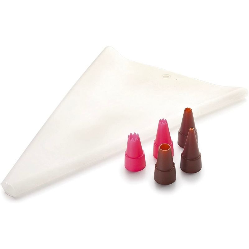 With this silicone piping bag set + 5 polypropylene nozzles, create original decorations with icing or buttercream quickly and efficiently. They are easy to clean as they are dishwasher safe and store easily.