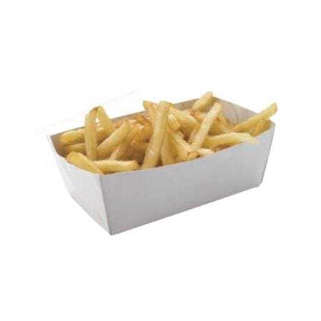 These trays are made of quality white kraft, a material known for its strength and durability. They measure 120 mm long and 70 mm deep, with a height of 45 mm, offering a capacity of 0.375 liters. Their rectangular shape is perfectly suited for a variety of uses, including fries or fruits. Thanks to a PE coating, they guarantee excellent resistance to grease and moisture, making them ideal for hot and moist foods without the risk of deterioration or alteration of flavors.