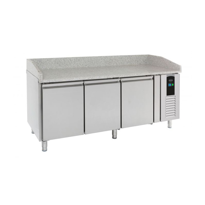 Nuestro mostrador para pizza está equipado con tres puertas batientes de acero inoxidable, garantizando una excelente aislamiento térmico. Podrá almacenar sus ingredientes en los diferentes recipientes GN 1/6 al alcance de la mano y conservar una reserva adicional en los armarios integrados. La superficie de trabajo en granito está especialmente diseñada para facilitar la preparación de las pizzas: se mantiene fresca y evita que la masa se pegue.