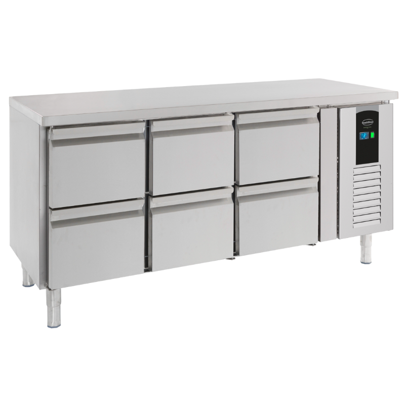 Además, el aparato está diseñado sin respaldo, permitiendo así su instalación contra una pared o en el centro de la cocina, ofreciendo una flexibilidad y una adaptabilidad a las diferentes configuraciones de cocina. Las dimensiones de los cajones están estandarizadas a las bandejas GN 1/1, asegurando una integración sin esfuerzo de los elementos comúnmente utilizados en el sector.